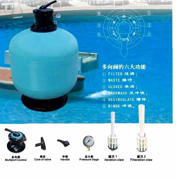 作用:過濾泳池水,使濁度降低。通過循環水泵抽水加壓將泳池(含按摩池,下同)水不斷輸送到過濾器使污物截留在過濾器的濾料(通常是采用特制粒徑的石英沙)面層,而干凈的水則穿過濾料得到凈化。