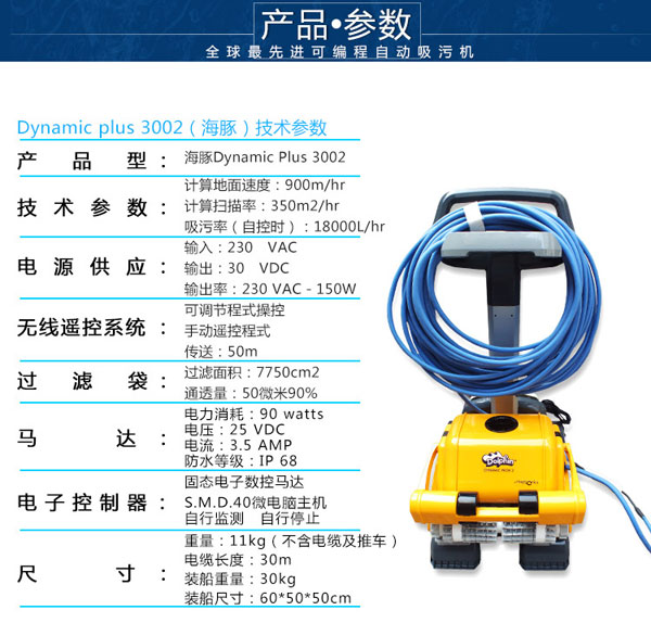 海豚3002全自動吸污機,本身設置有智能程序控制裝,可編程,根據游泳池的大小設定不同的模式,具有掃描泳池,鎖定記憶等功能。智能化全自動的清潔泳池,靈活方便。不用人工操作,省時省力。