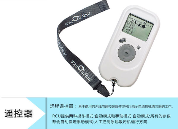 3002型海豚吸污機帶遙控,可以控制吸污機走向,在岸邊用遙控器指示機器進入難以到達的角落進行清洗,做到徹底清潔泳池,無死角吸污。