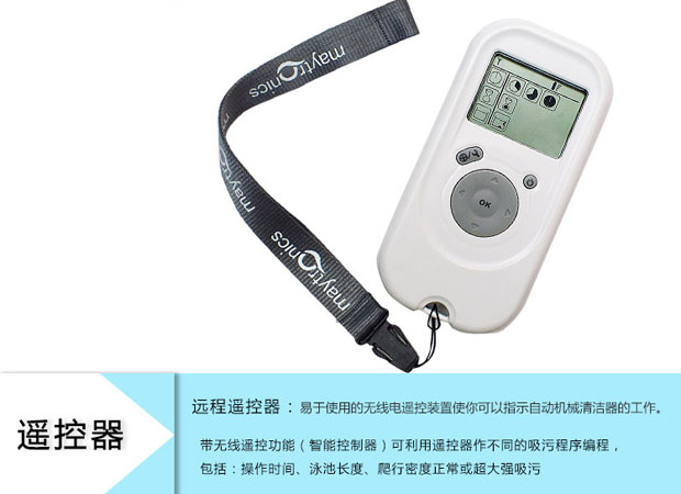 2、可利用遙控器作不同的吸污程序編程,包括:操作時(shí)間、泳池長(zhǎng)度、爬行密度正;虺髲(qiáng)吸污等等。